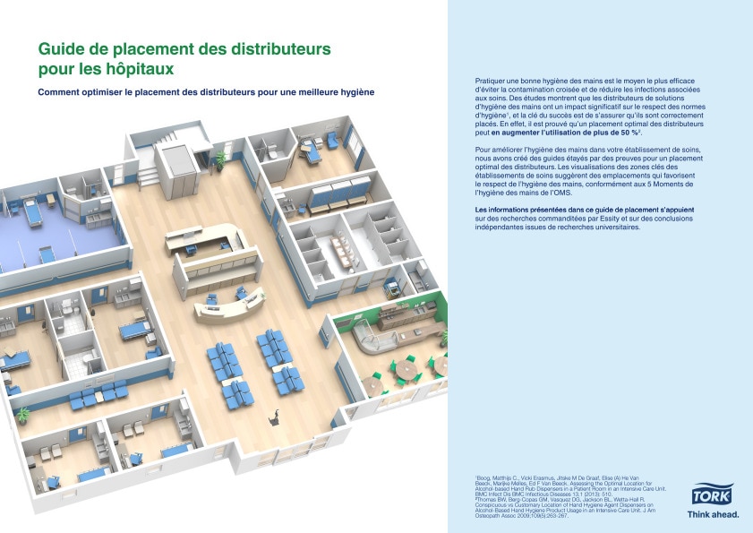 Pour améliorer l’hygiène des mains dans votre établissement de soins, nous avons créé un guide pour un placement optimal des distributeurs. Les illustrations suggèrent d’installer les distributeurs de façon à favoriser l’observance de l’hygiène des mains en gardant les 5 Moments de l’hygiène des mains de l’OMS à l’esprit. Les informations contenues dans ce guide se basent sur des recherches initiées par Essity et des conclusions indépendantes tirées de recherches universitaires. Le guide est établi autour de trois zones que l’on trouve généralement dans les établissements de soins :