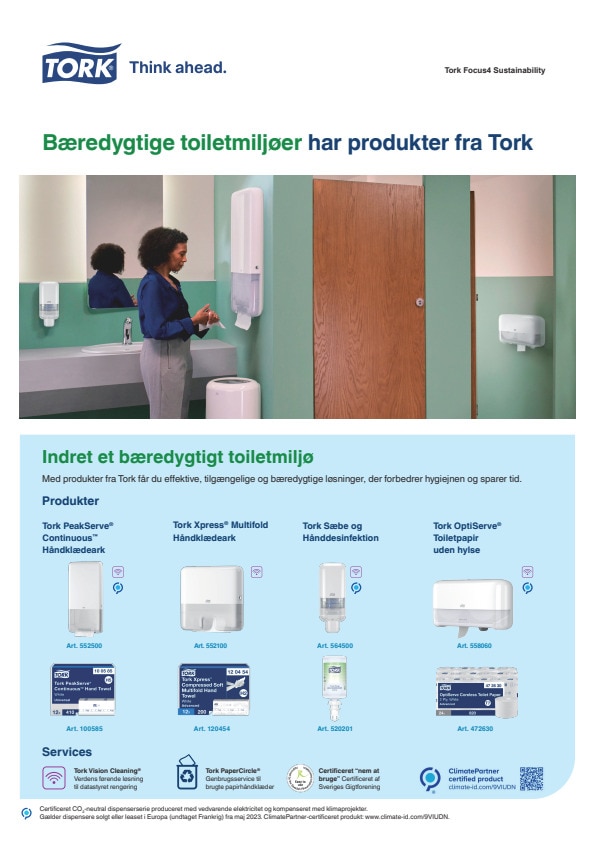 Tork, et Essity brand, er fremsynet og tilbyder sine kunder bæredygtige hygiejneløsninger. Læs mere om vores ambitiøse mål for klimaet.3