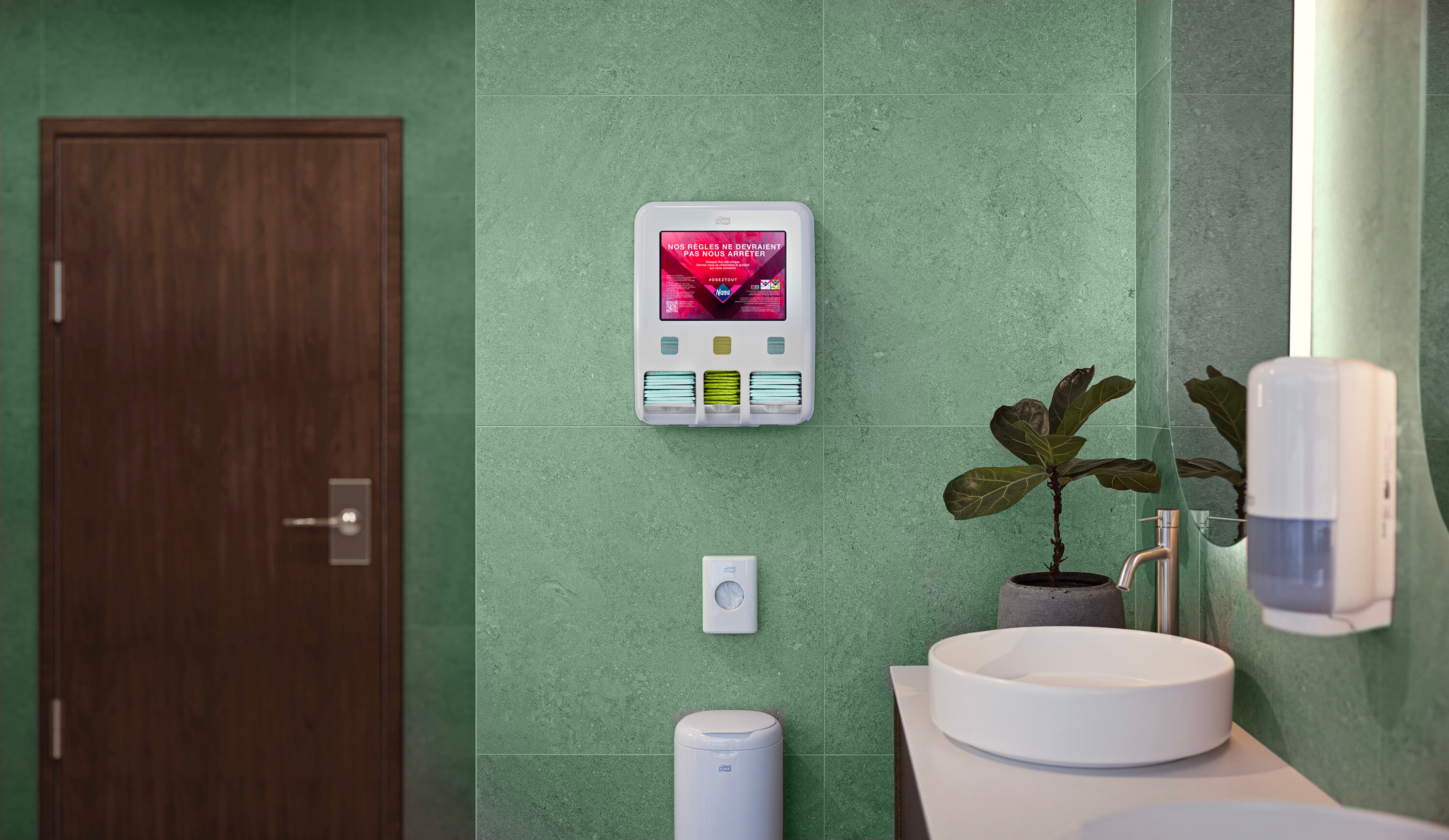 Le distributeur Tork facilite l’accès aux protections hygiéniques.